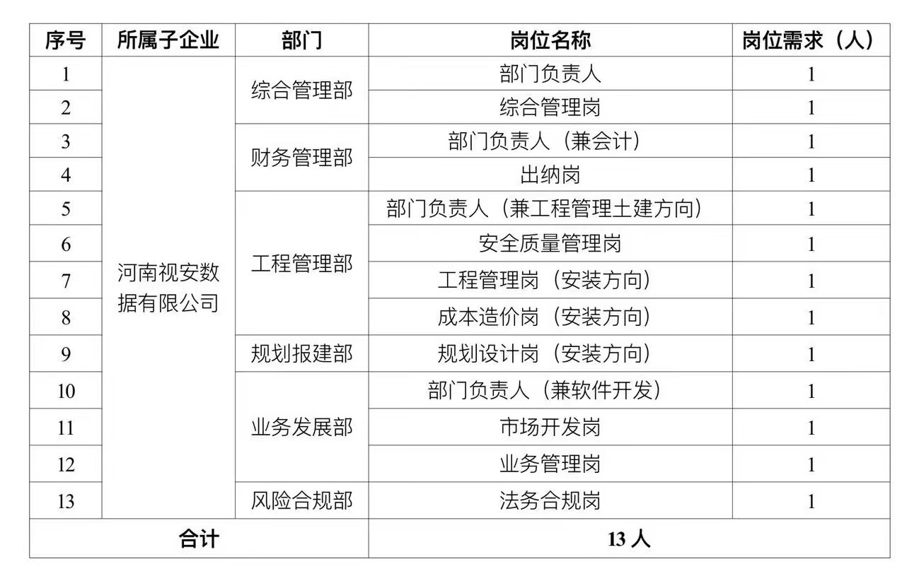 根據河南鐵建投物流有限公司工作計劃,為滿足河南視安數據有限公司項目建設運營人才需求,確保數字物流綜合服務多式聯運智慧樞紐項目建設、倉儲、信息化服務等高鐵物流業務順利實施?,F面向社會公開招聘13人,有關事宜公告如下: